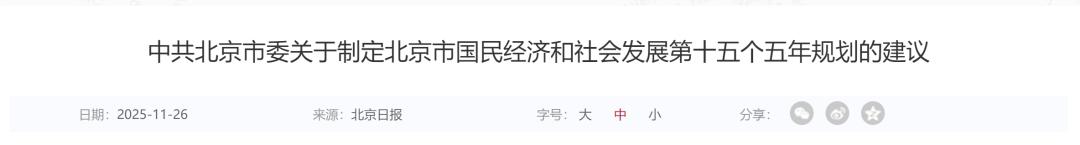 11月25日,北京政府官网发布了《中共北京市委关于制定北京市国民经济和社会发展第十五个五年规划的建议》(以下简称《建议》)。