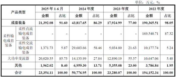 业绩巨震的核心症结,在于公司主力业务——柔性直流输电成套装备的突然断档。作为公司收入的“压舱石”,该业务在2022年贡献了16.95亿元收入,占当年总营收的87.3%,但此后便从收入构成中“消失”。2023年至今,公司收入主要依靠柔性交流输电成套装备支撑,业务结构的单一性暴露无遗。